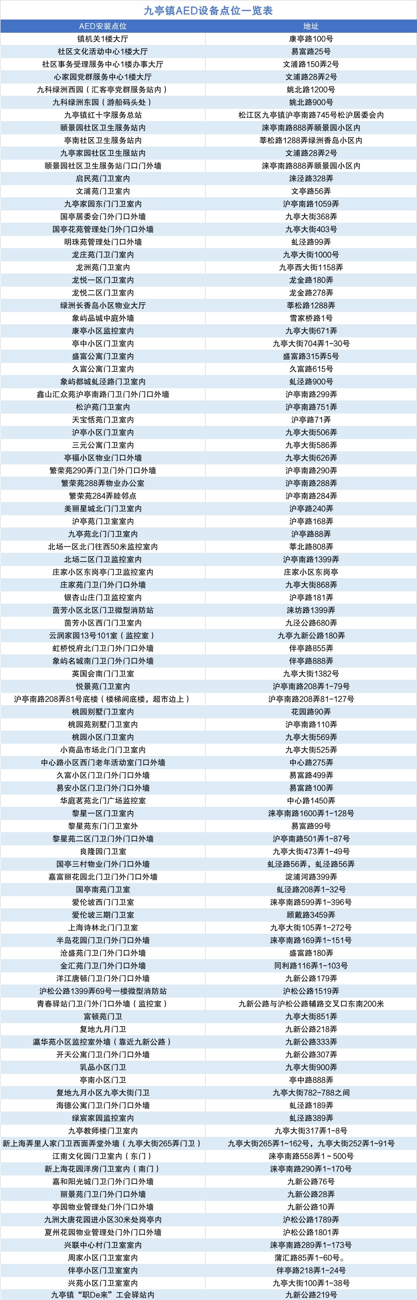 借助本年度松江区民生实事项目“在居民住宅小区增配不低于700台自动式体外除颤器(AED)”的契机,九亭镇已完成全镇89个小区AED安装工作,AED数量由原先的11台增加至100台,急救网络不断织密织大,为辖区居民构筑起了一道坚实的安全防线。