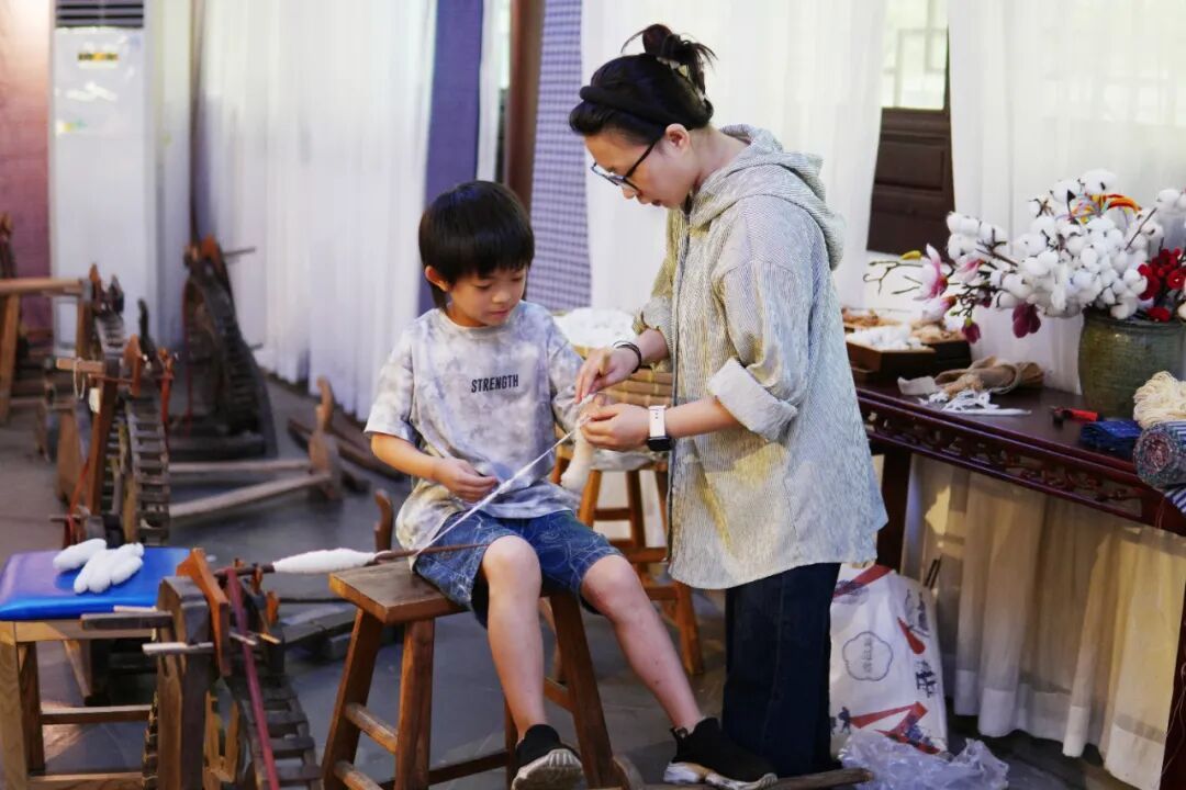 孩子们都想知道棉絮在老师手中是如何被快速地拉成连绵不断的纱线。黄道婆发明创造的三锭纺车作为那个时代的新科技,极大地提升了棉纺织业的发展,老师边介绍边示范如何纺线。“慢一点,脚踩得太快,手上跟不上,纱线就容易断。”在老师的细心指导下,看似简单的动作却极度考验协调性与耐心,孩子们渐渐掌握了要领,一点点将棉絮在抽捻中变成纱线,感受元代的科技发展。