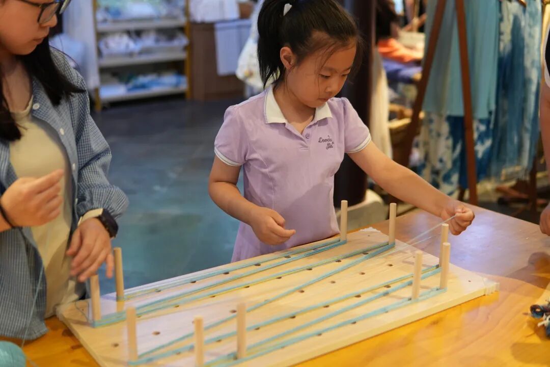 经线是纱线上织机前最重要且考验经验的一步。成千上万根经线经过精准编排,最终会成为独特的纹样。在先棉大讲堂上,新生代文化讲述者带来了一场以“经纬生花”为题的分享,让孩子们了解了中华传统服饰中那些繁复且惊艳的纹样背后的编排逻辑。在动手实践中,孩子们明白了“脑中一张图、手中一根线”的精妙之处,更惊叹于古人们所开创的如此精密又美轮美奂的纹样世界。
