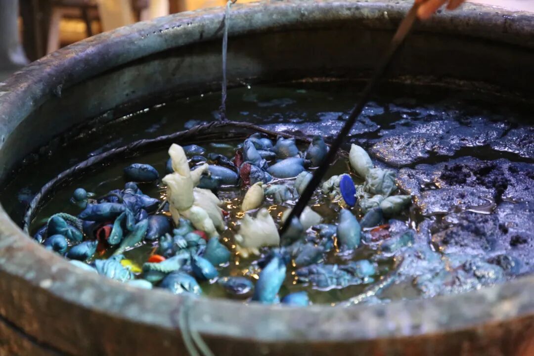 植染技术为布匹绘上了艳丽和光泽。孩子们以蓝草为墨,将白色的布匹浸染成迷人的蓝靛,深浅不一、纹路各异,而每一条小蛇偶都成为了独一无二的“作品”。