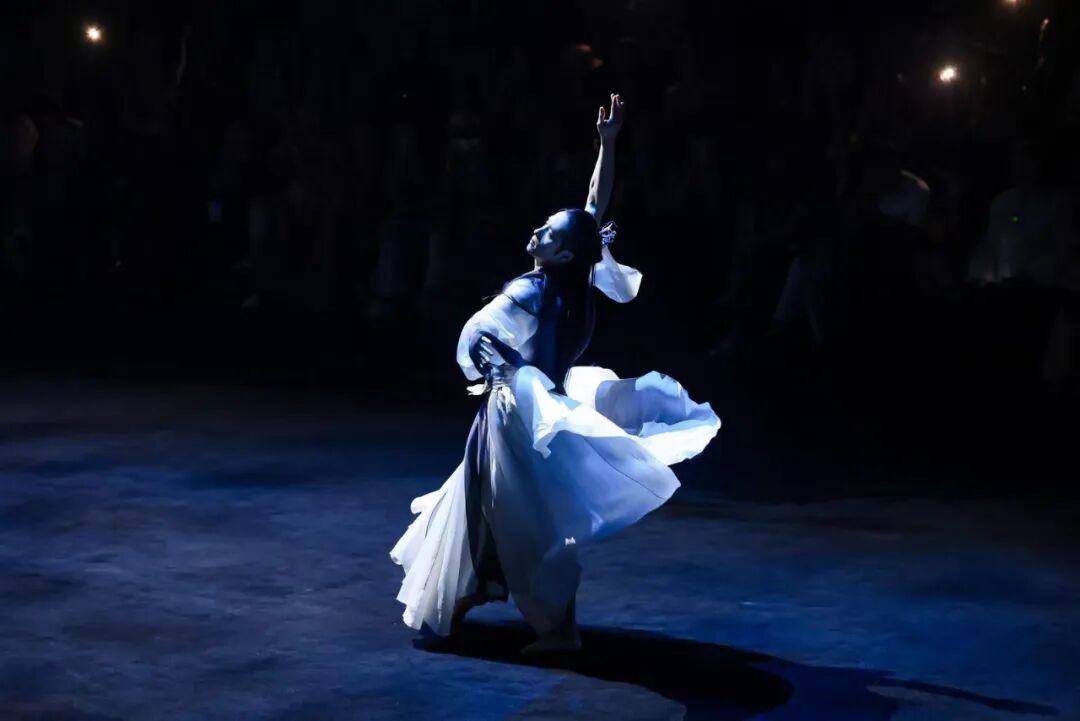 随着低沉鼓点与音乐渐起,舞台中央,舞者张翰以极具张力的肢体语言,配合着翩翩水袖,将屈原不屈的精神与气魄展现得淋漓尽致。层层叠加的旋律与音效远近交替,时行时止,瞬间将观众拉回两千年前的楚地时空。