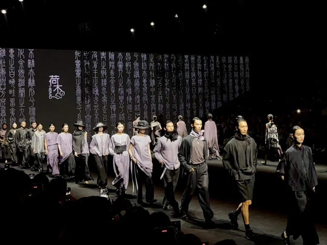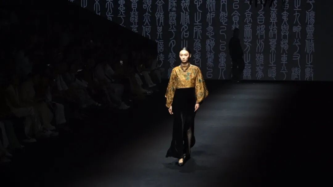 舞韵未尽,灯光转亮,中外模特身着不同款式风格的服饰,从T台另一端缓步而来。衣襟上盛开的兰花、织物上蜿蜒的楚国龙凤纹样,配合着篆体字的舞台置景,将那段跨越时空的历史娓娓道来。