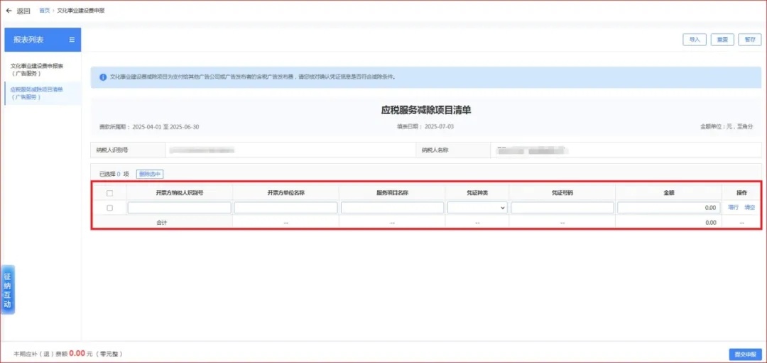 1.若缴费人同时发生广告业和娱乐业应税行为时,可在申报页面分别填报《文化事业建设费申报表(娱乐服务)》和《文化事业建设费申报表(广告服务)》《应税服务减除项目清单(广告服务)》。