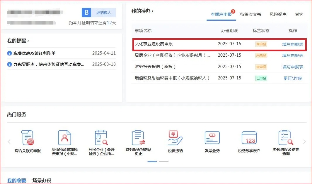 也可以通过【我要办税】-【税费申报及缴纳】-【非税收入申报】-【文化事业建设费申报】功能菜单进入申报页面。
