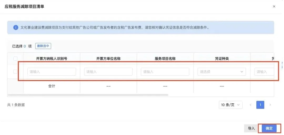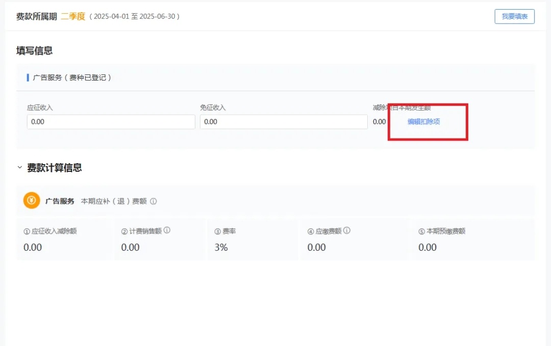 1.进入申报界面默认为补录式申报,需确认数据是否正确,可进行补充。如提供广告服务的缴费人需要扣除支付给其他广告公司或广告发布者的含税广告发布费的,点击【编辑扣除项】可填写《应税服务减除项目清单》。
