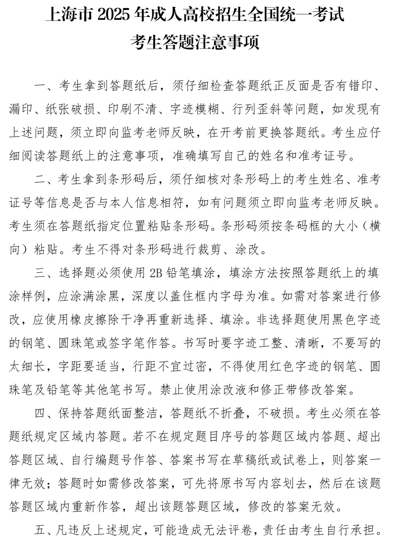 1.请考生本人自行下载打印本次考试准考证。准考证下载网址:https://czbm.shmeea.edu.cn/。下载打印时间:2025年10月11日-10月17日(每天9:00-22:00),10月18日-10月19日(每天7:00-22:00)。考生务必仔细看清准考证上的考试时间、地点和备注等信息,关注考试当天交通及天气情况,合理安排出行时间及路线,提前60分钟到达考点。