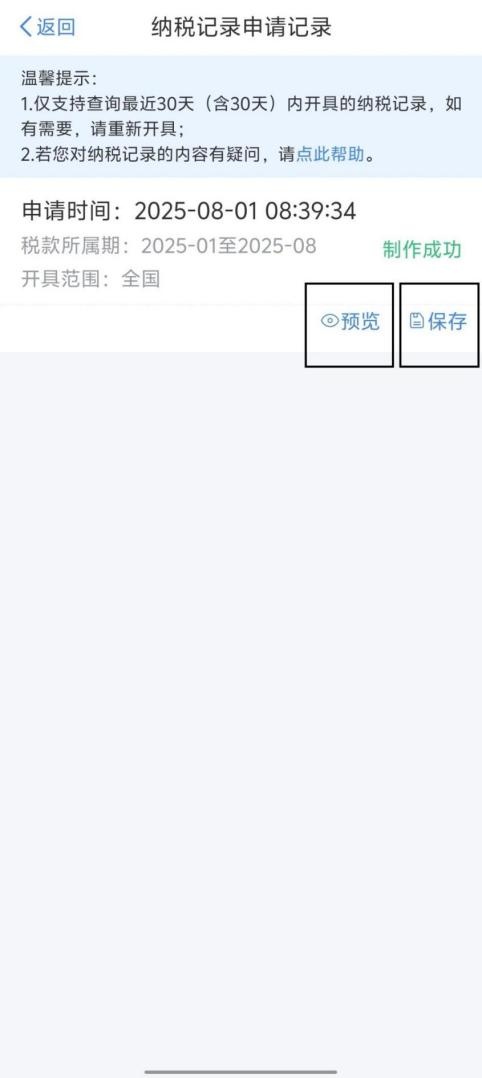 ③系统显示“制作成功”后,点击【预览】按钮查看纳税记录(确认无误后,可长按预览图片选择保存至手机相册);或直接点击【保存】按钮,一键保存纳税记录图片到手机相册。