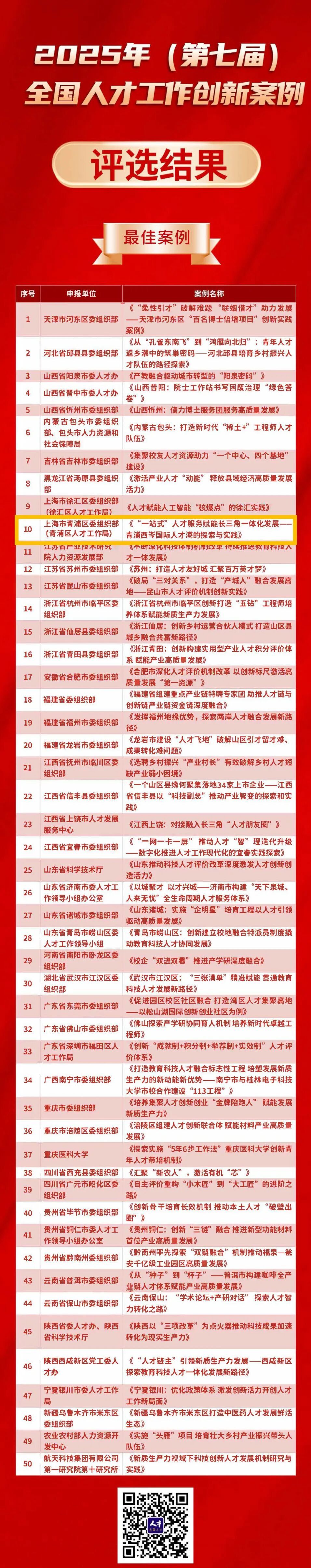 在2025年(第七届)全国人才工作创新案例评选结果中,由上海市青浦区委组织部、区人才工作局报送的《“一站式”人才服务赋能长三角一体化发展——青浦西岑国际人才港的探索与实践》案例,从全国1200余个案例中脱颖而出,荣获“最佳案例”奖。 本次评选活动由中国人才杂志社主办,旨在展示各地深入实施新时代人才强国战略的创新实践成果,共评出50个最佳案例。青浦以建设西岑国际人才港为实践切口,通过梳理“一站式”人才服务改革的探索路径,努力呈现青浦在服务国家战略、推进区域协同发展以及服务华为等重点企业中的担当与初步成效。