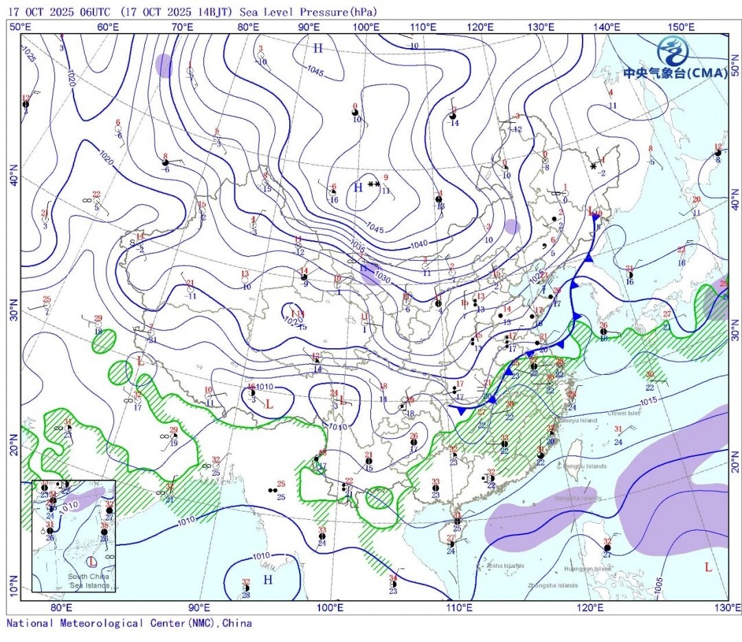 今天早晨起风力明显增大,北到东北风5级阵风6~7级,沿江沿海地区更大。气温一路下跌,最高气温出现在早晨,在24℃左右,夜间气温降至21℃以下。