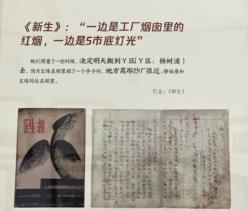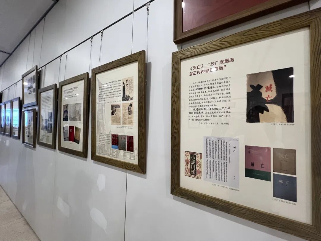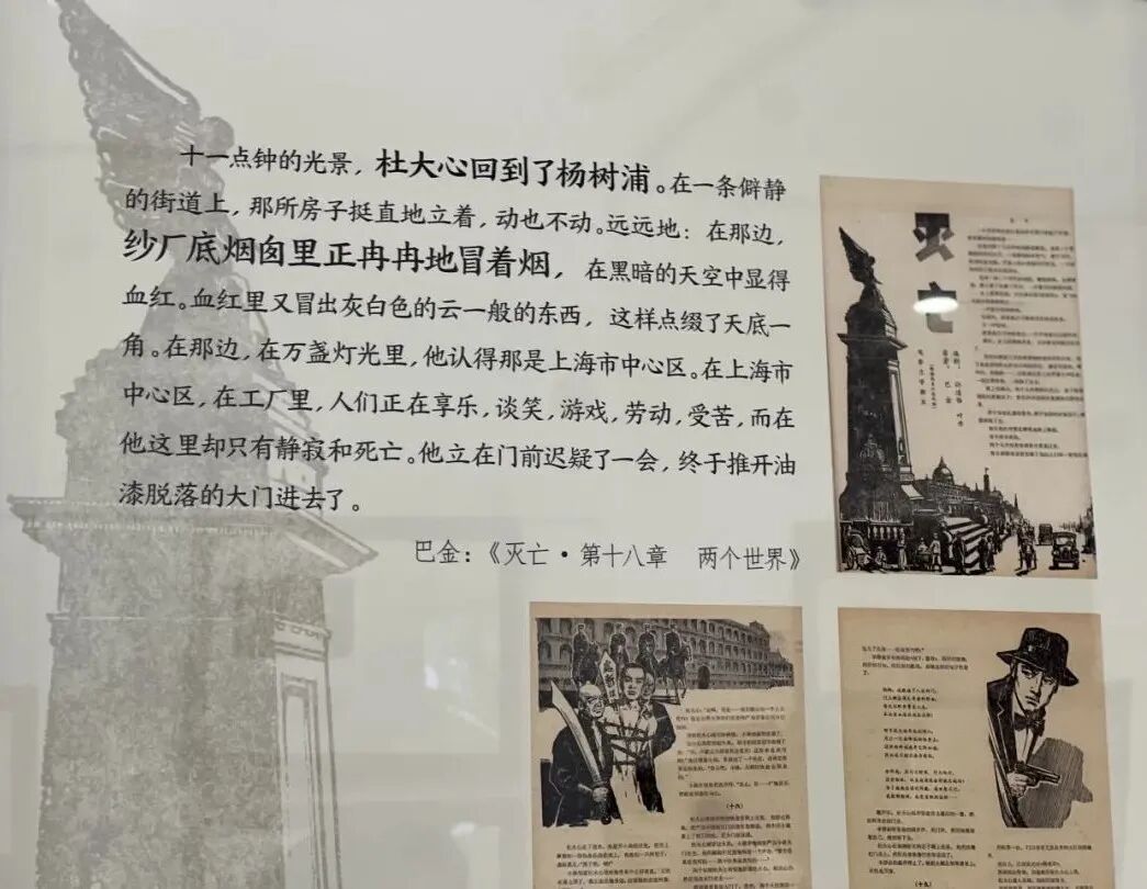 步入展厅,首先映入眼帘的是上篇——“巴金与杨浦百年工业”。这里聚焦巴金早期小说《灭亡》《新生》等作品中描写的杨树浦工厂景象,经由精心排版,配以文字说明,以“纱厂、烟囱、包身工”等一系列高频出现的典型意象,生动刻画出小视角背后的大时代,展现出20世纪30年代杨浦的工业面貌和工人运动状况。