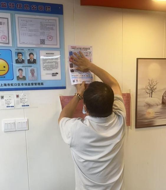 当天下午,马老师以及户外招牌备案负责人、运维服务团队一行便来到店内,在醒目位置张贴上崭新的《上海市生活垃圾分类投放指南》和《上海市市容环境卫生责任区责任告知书》,随后协助商户通过“一网通办”虹口区“开店一件事”专栏提交相关材料。仅用十五分钟,户外招牌备案申请就高效完成。
