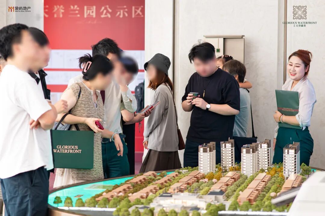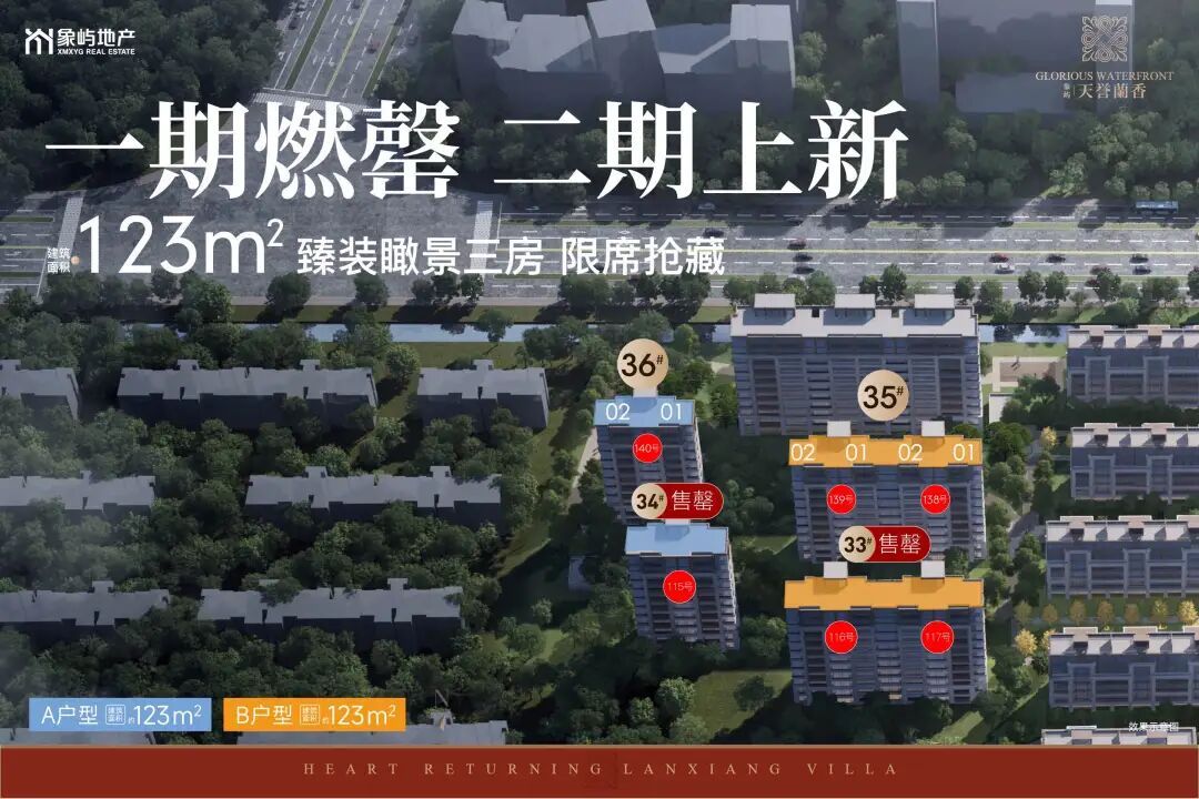 项目临时售楼处及建面约123平方米样板间8月31日正式开放,开放首日仅上午就吸引超过百组客户预约参观。第一批首开33、34号,共66套,正对兰香湖,9月24日认筹并触发积分,认筹比超180%,入围分30分。二批次加推的35、36号位于首批两幢楼栋北侧,面积约123平方米,截至目前二期认筹已结束,预计10月24日开盘。