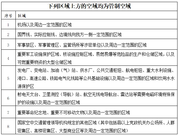 管制空域:真高120米以上空域,空中禁区、空中限制区以及周边空域,军用航空超低空飞行空域,以及下列区域上方的空域。