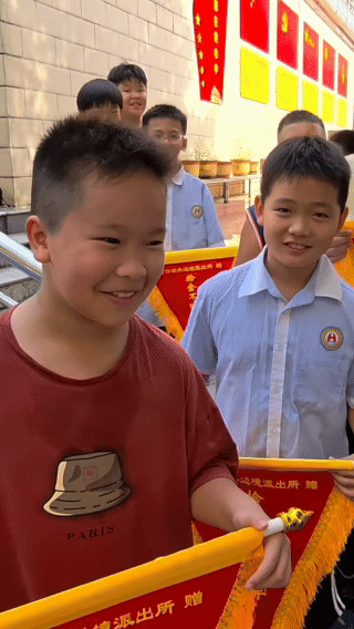 孩子们在欢呼声中接过锦旗