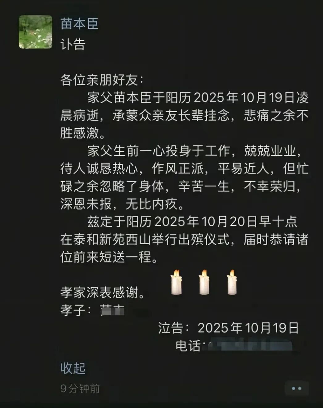 苗校长的儿子告诉记者,苗校长因突发心血管疾病离世。讣告中写道:“家父生前一心投身于工作,兢兢业业,待人诚恳热心,作风正派,平易近人,但忙碌之余忽略了身体,辛苦一生,不幸荣归。”