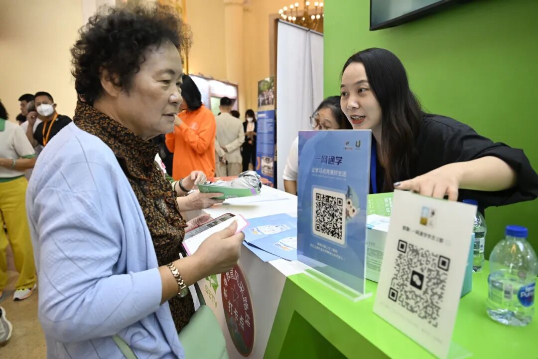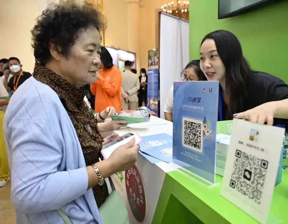 线上平台不断延伸的同时,线下服务也在持续深耕。课程展现场,上海开放大学展区人头攒动,成为观察上海老年教育未来图景的重要窗口。