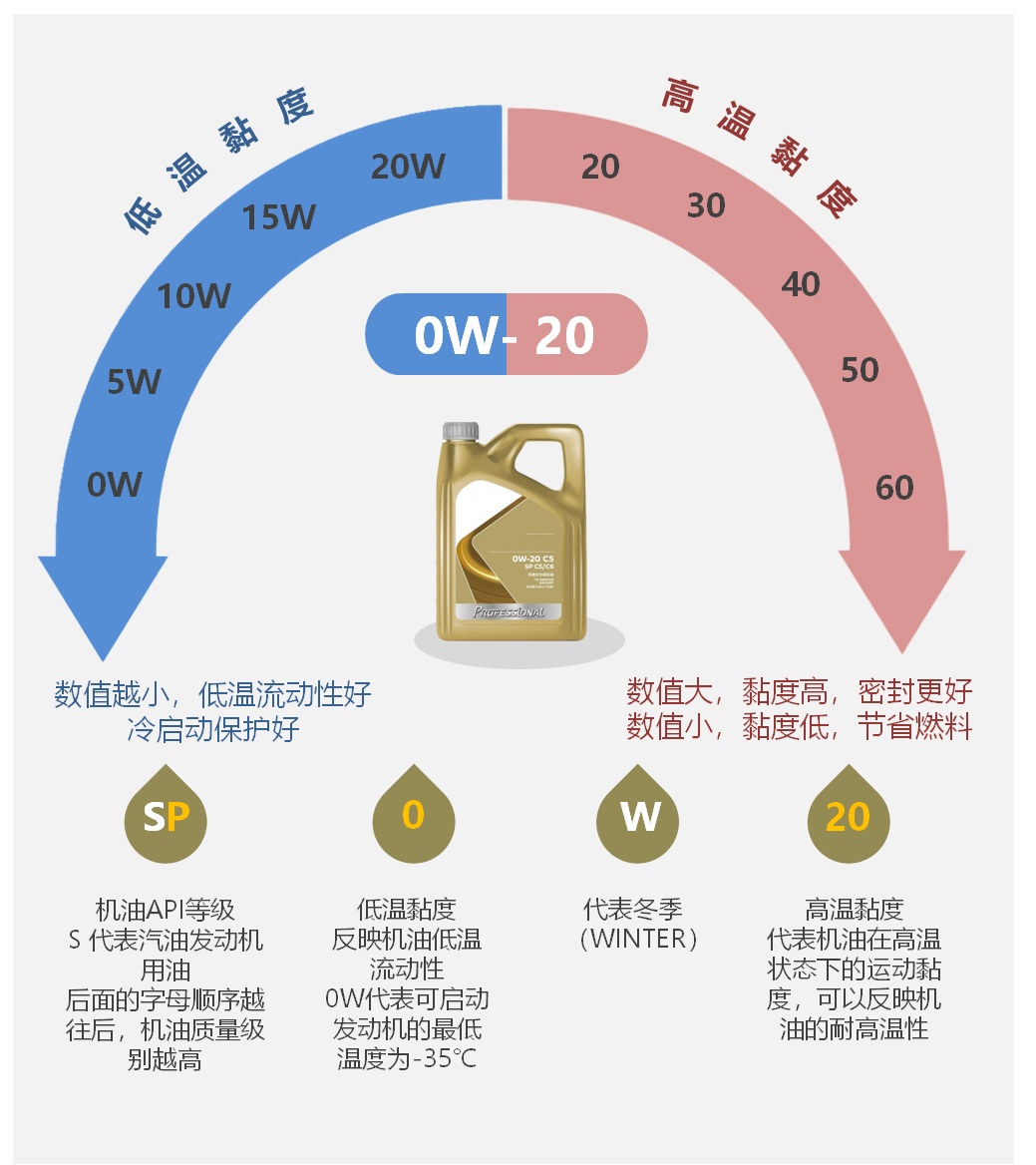 简单来说,0W-20是机油的黏度等级,表示该机油在-35℃低温下仍能保持良好流动性,且在100℃高温时的运动黏度为20。