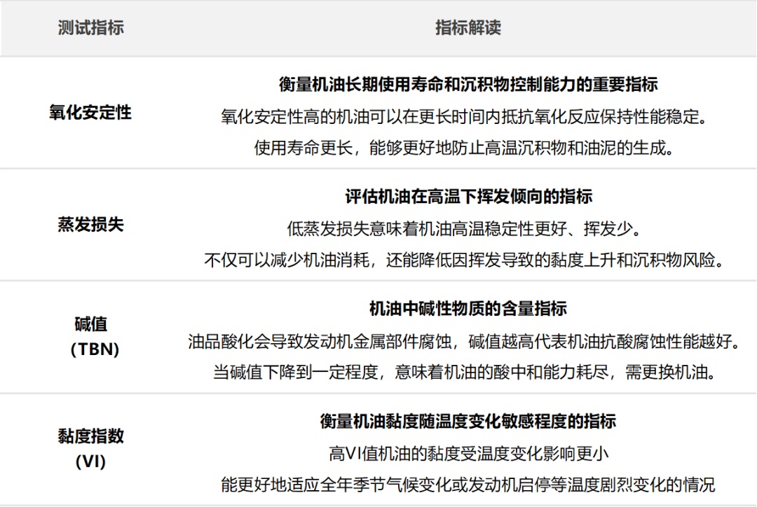 通过低温动力黏度、低温泵送黏度、高温高剪切黏度、磨斑直径、氧化安定性、蒸发损失、黏度指数、倾点、碱值等关键指标测试,评估机油的综合性能表现。