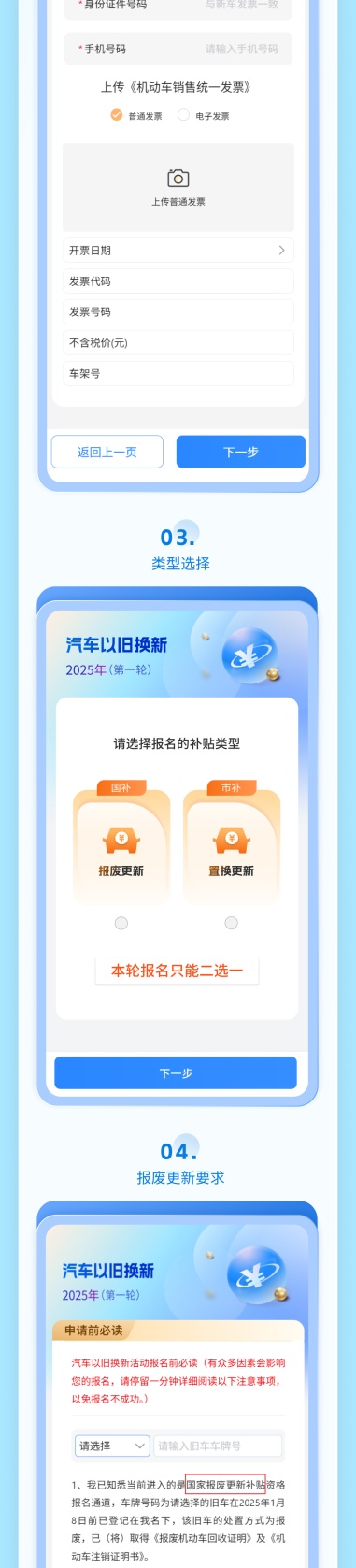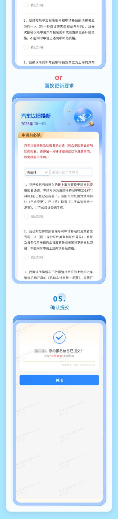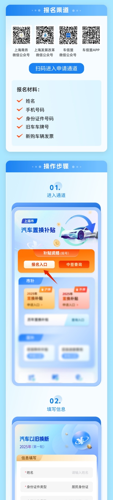 符合条件的个人消费者可在规定时间内通过“上海商务”微信公众号等平台,从“政务服务-汽车置换补贴申请-补贴资格”进入报名入口,并选择“报废更新”或“置换更新”参加报名。个人消费者报名时需填报并授权平台使用相关个人信息,包括姓名、手机号码、身份证件号码、旧车车牌号、新购车辆发票等信息。