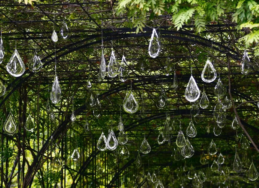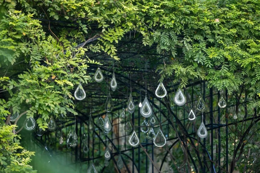 位于公园西侧的紫藤花架下,600个银色曼陀罗风铃如雨滴般垂落,构成长达30米的“定格雨廊”。