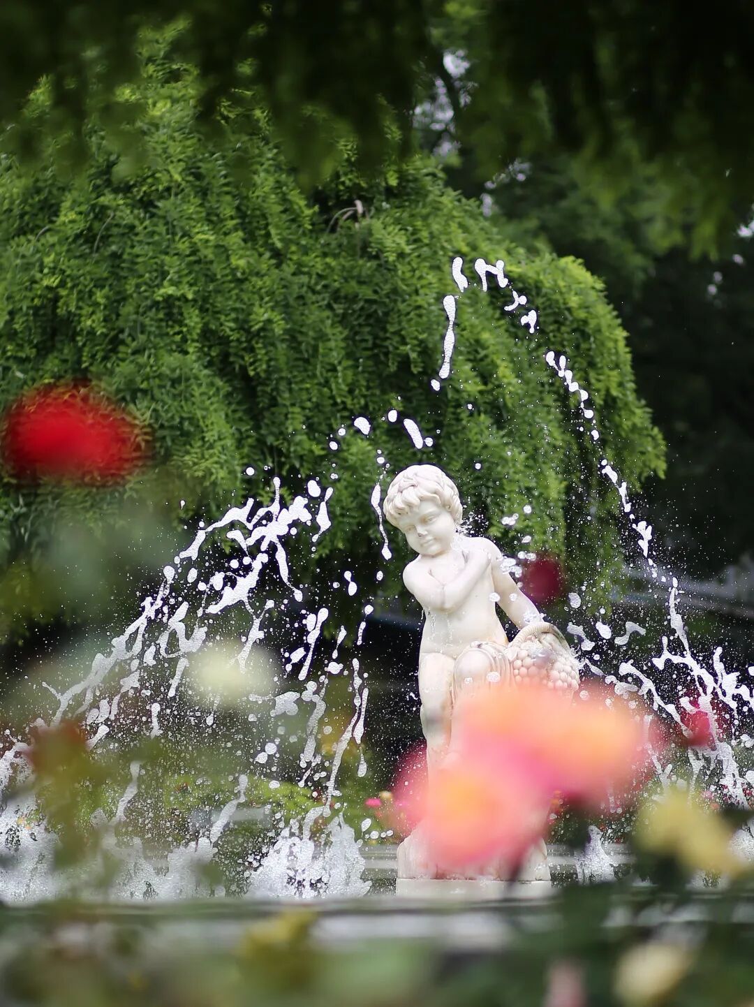 中央喷水池与毛毡花坛以几何线条铺陈,倒映着蓝天白云,随手一拍就是复古大片。
