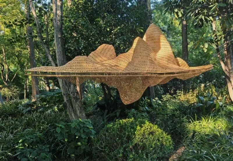 《无根山》以传统竹编技艺为融合媒介,将自然山水意象与民间造物文化有机结合。整体造型分为上下两个部分:上半部采用细密编织技法,紧密有力,凸显山峦的巍峨与稳重;下半部运用镂空的编织手法,轻盈通透,演绎群山的空灵之美。