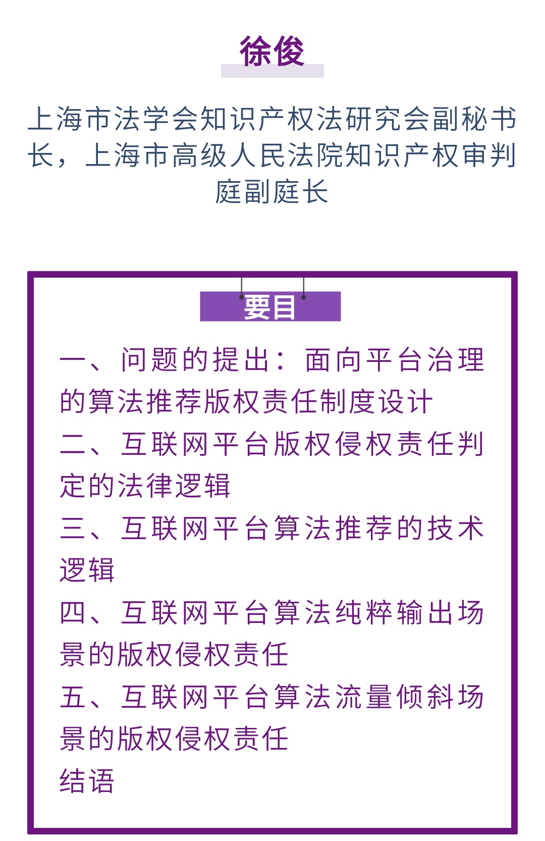 《政法论坛》网络首发 || 徐俊:互联网平台算法推荐的版权侵权责任研究