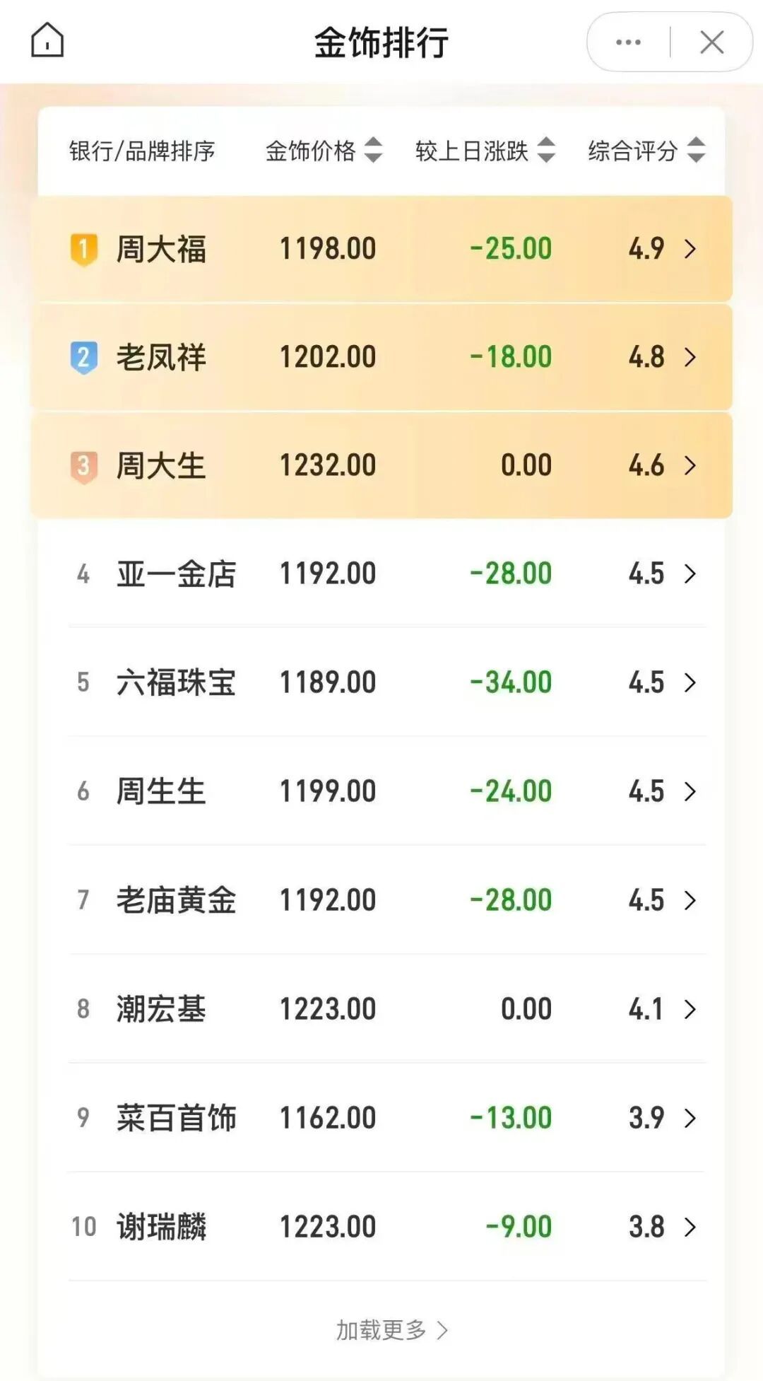 国际金价下跌,国内金饰零售市场价格也随之调整。28日上午,周大福金饰挂牌价调至1198元/克,较前一日下跌25元/克;六福珠宝跌破1200元/克至1189元/克,较前一日下跌34元/克。