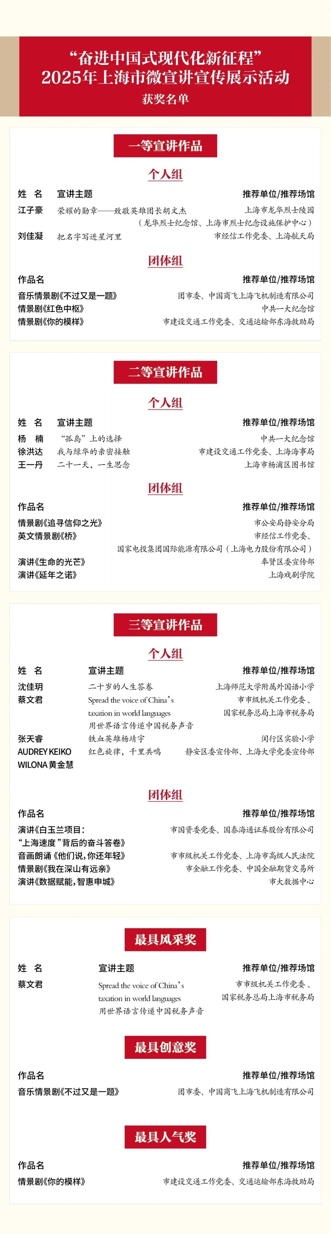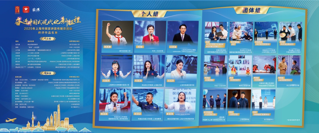 讲好新时代奋进故事,传递中国式现代化的上海声音。10月28日,“奋进中国式现代化新征程”2025年上海市微宣讲宣传展示活动终评圆满落幕。来自全市各行各业的9位个人选手和11组团体选手同台竞技,经过专家评委现场评分与观众票选,活动各大奖项获奖名单出炉。详见↓ 本次活动由市委宣传部会同市委外宣办、市委党史研究室、市教卫工作党委、市经信工作党委、市国资委党委、团市委、市社联等单位共同举办。自今年7月启动以来,共收到个人组、团体组及校园组宣讲作品1185件。经过层层选拔,20组选手脱颖而出,站上终评舞台,以真切感悟、多元视角以及丰富的文艺形式,生动讲述新时代红色故事和中国式现代化上海篇章的生动实践。 经过评委的严格评选和观众现场投票,活动最终评出一等宣讲作品5个、二等宣讲作品7个、三等宣讲作品8个,单项奖“最具风采奖”“最具创意奖”和“最具人气奖”,并现场向获奖选手颁奖。 晋级终评活动的选手大多来自行业一线,他们立足上海丰富红色资源和鲜活实践场景,围绕赓续红色血脉、“五个中心”建设、人民城市、高质量发展、科技创新、乡村振兴等不同主题,用身边事解读大政策,用小切口展现大时代,从不同侧面折射出人民城市的璀璨光彩,共同描绘出中国式现代化上海实践的奋进画卷。 个人组一等宣讲作品 龙华烈士陵园推荐,江子豪《荣耀的勋章——致敬英雄团长胡文杰》 从放弃优渥生活毅然支援抗战的英烈毛丽瑛,到克服万难为双胞胎捐献干细胞的志愿者,从苹果期货扶贫助农的温暖故事到风云卫星、国产大飞机等“国之重器”研制测试背后的艰辛历程……现场宣讲中,有鲜为人知的红色故事,也有真实鲜活的行业佳话;有凡人微光的温暖力量,亦不乏大国工匠们的精神智慧。真实精彩的内容、真挚动情的演绎打动着在场的每一位观众,传递着中国式现代化上海实践的底蕴力量和厚重温度。 音乐剧、情景剧、音画朗诵……本次终评活动中,不少团队作品充分发挥文艺表演的魅力,创新采用沉浸式、互动式的多元宣讲方式,带领观众走进国产大飞机试飞背后的梦想与坚持,探索国泰海通191天世纪合并奇迹背后的关键,了解大数据如何造福城市生活与营商环境…… 本届宣讲活动涌现出了一大批优秀的宣讲人才和主题故事,后续将纳入“党的诞生地”红色文化宣讲团的培育宣传,为讲好新时代故事、传播上海精彩注入全新活力,为上海充分发挥推进中国式现代化龙头带动和示范引领作用,在接续奋斗中谱写人民城市建设的新篇章凝聚精神力量。
