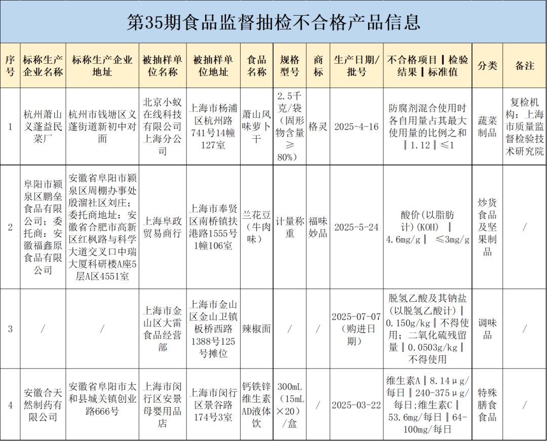 对上述抽检中发现的不合格产品,市市场监管局已要求相关区市场监督管理局及时对不合格食品及其生产经营者进行调查处理,依法查处违法行为,进一步督促经营者履行法定义务,并将相关情况记入食品生产经营者食品安全信用档案。查处情况由经营者所在地负责案件查办的区市场监督管理局按规定公开。