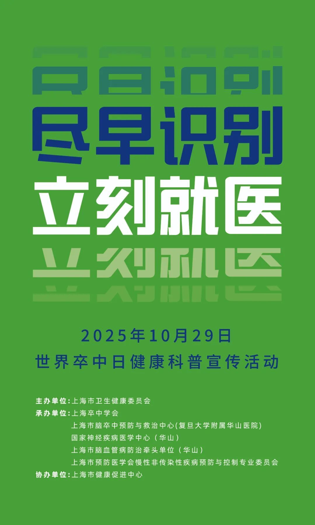 2025年10月29日是第20个“世界卒中日”。今年活动的主题是“尽早识别,立刻就医”。作为上海市脑卒中预防与救治中心(上海市脑卒中预防与救治服务体系建设项目挂靠单位)、上海市神经内科临床质量控制中心挂靠单位,近日,复旦大学附属华山医院积极贯彻落实《健康上海行动》要求,在上海市卫生健康委的指导下,牵头启动上海市2025年世界卒中日系列科普宣传活动,发布重磅更新的《上海市脑卒中急救地图(2025年)》,建立覆盖全市的立体化宣传网络,提升市民的健康意识,为市民健康保驾护航。