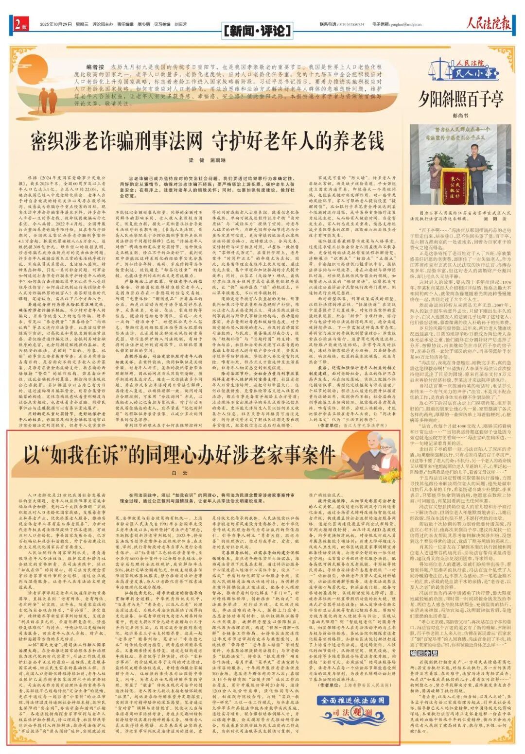 人民法院作为国家审判机关,肩负着保障老年人合法权益、维护家庭和谐与社会稳定的重要职责。在司法实践中,须以“如我在诉”的同理心,将司法为民理念贯穿涉老家事案件审理全过程,通过公正裁判与温情服务,让老年人共享法治文明建设成果。