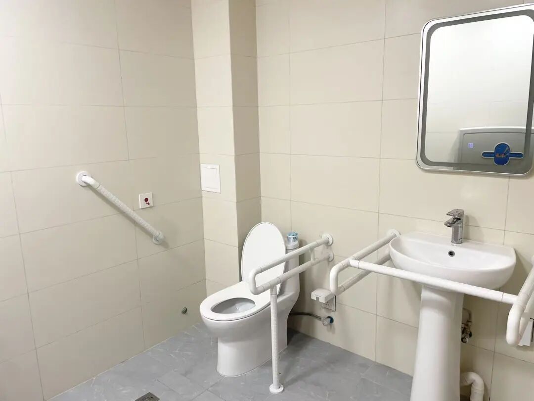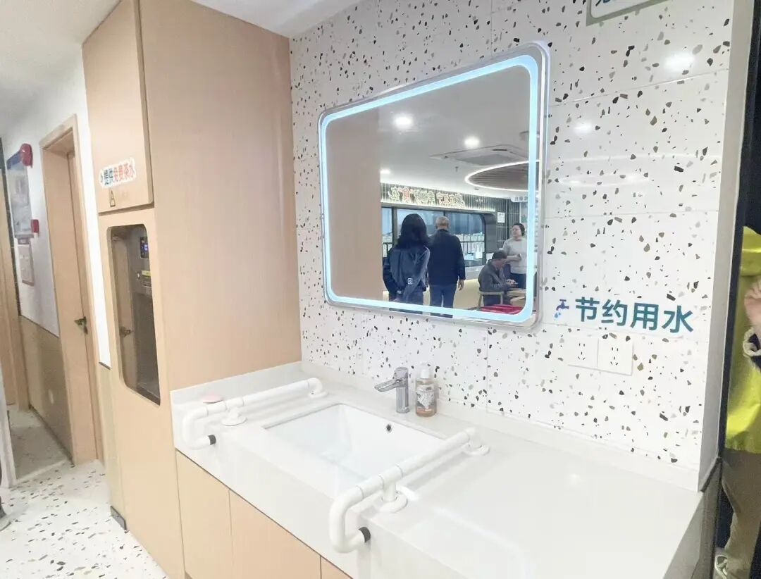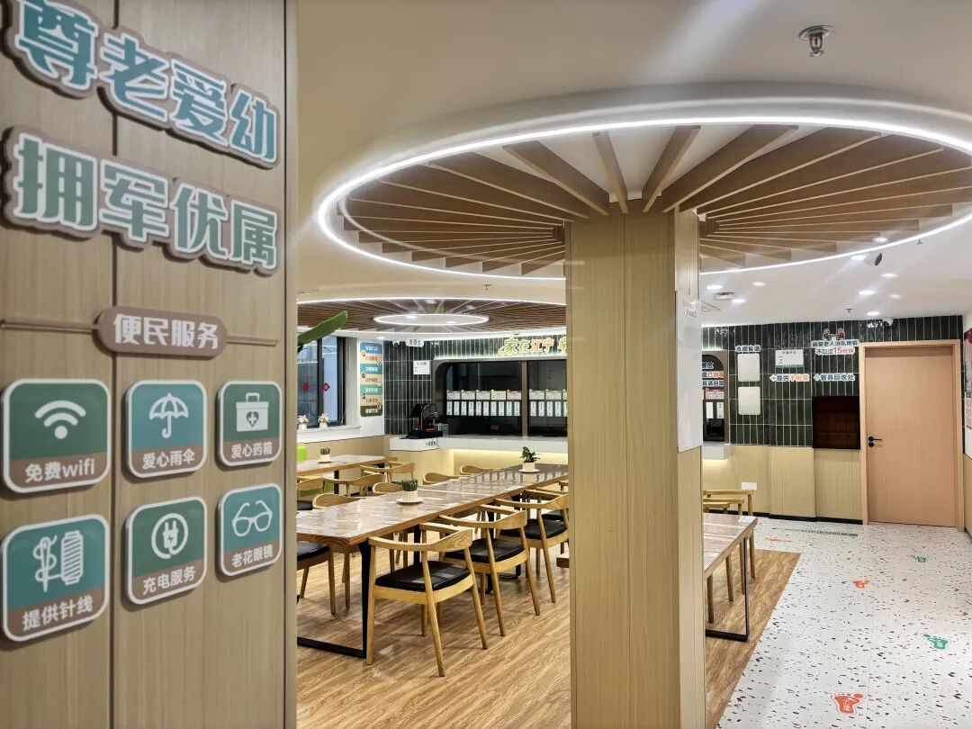 就餐空间更宽敞、动线更合理,老人取餐、入座更顺畅;新增的无障碍卫生间采用移门设计,解决了空间局促的问题,折叠母婴台的设置兼顾了全人群需求;贴墙的绿色卡座清新亮眼,既增加了座位,又添了几分活力;吸顶式空调取代了立柜式空调,腾出不少空间,再加上整体提亮的光源,处处透着温馨。