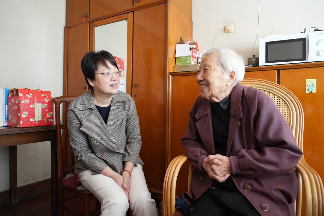 杭春芳一行来到真如西村,看望101岁的施福年老人,为她送上鲜花和节日问候。虽是百岁高龄,老人依然精神矍铄,日常生活充实。杭春芳与老人并肩而坐,关切地询问她的身体和生活状况,得知老人一家四世同堂、家庭和睦,且享受长护险服务,护理员每周七天上门协助生活起居,杭春芳深感欣慰,并叮嘱街道要继续用心用情做好为老服务,把关怀落到实处。现场一片欢声笑语,老人脸上也洋溢着幸福的笑容。