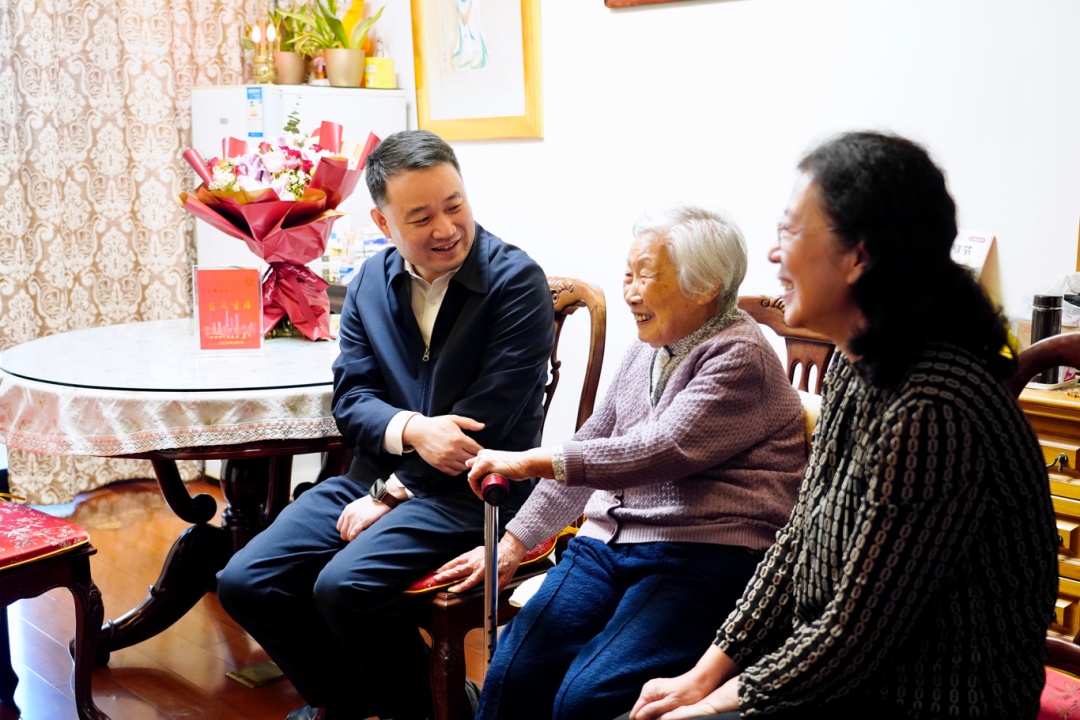 赵亮一行来到居住在蔚蓝水岸小区的百岁老人傅振煦家中,向老人送上鲜花,表达节日的问候和祝福。傅阿婆1925年出生,今年刚满100周岁,退休前在上海绣品厂从事图案设计工作,现与儿子儿媳同住,家庭关系和睦融洽。看到老人精神矍铄、交谈自如,赵亮倍感欣慰,“祝您节日快乐!看到您身体健康就是我们最高兴的事。”他认真倾听老人讲述生活经历与人生感悟,指出,爱老助老是大家的共同责任,更折射出基层治理的温度与成效。相关部门和街道社区要聚焦老年群体“急难愁盼”问题,一如既往做好老龄工作,帮助实现老有所养、老有所依、老有所乐、老有所安。