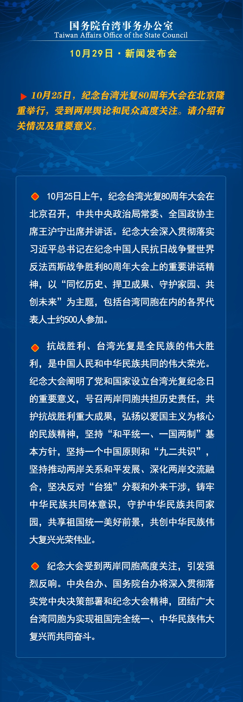 国台办:深入贯彻纪念台湾光复80周年大会精神,团结台胞为国家统一、民族复兴而共同奋斗