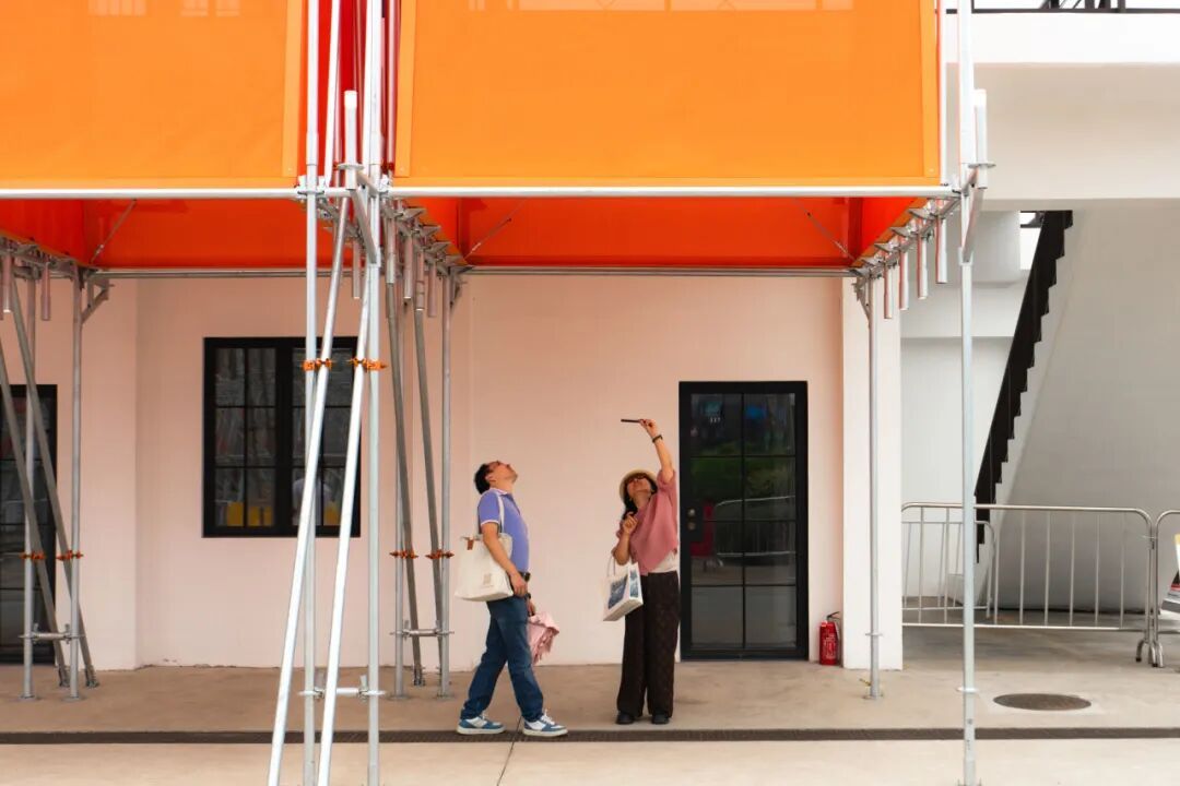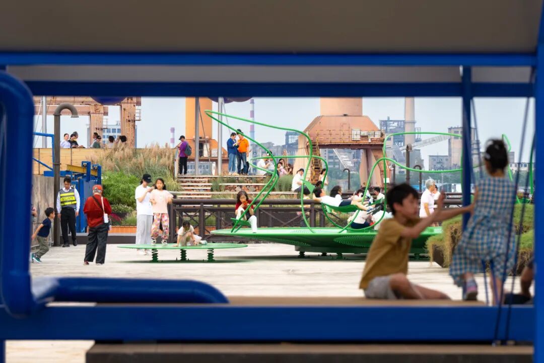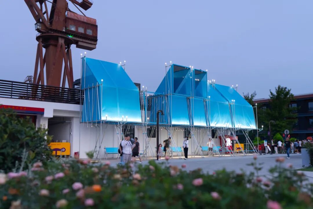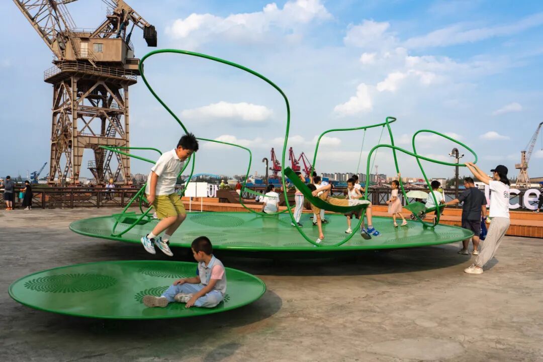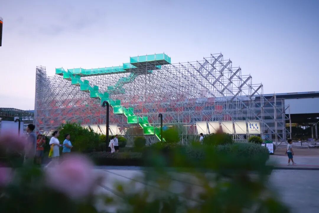 在杨浦复兴岛工业遗址上,脚手架构筑的“众山集”拔地而起。山下有热闹非凡的斜顶市集,山顶有可尽览浦江壮阔景色的露天平台。山上山下通过楼梯和平台相互连接,攀爬之余可驻足休憩、可登高望远,也可随时俯瞰山下热闹的市集。“众山集”将市井烟火与城市记忆相融合,成为黄浦江畔日常诗意与工业遗址共生的新地标。