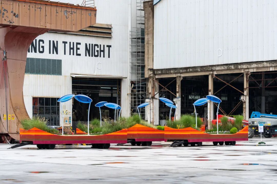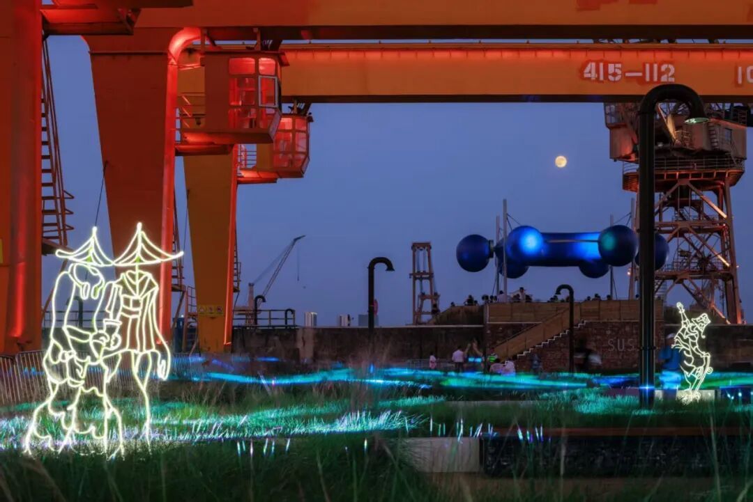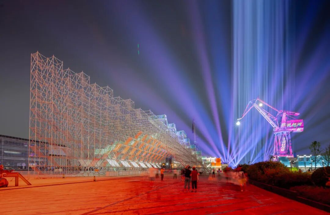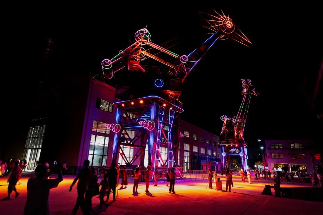 作品以上海船台公园工业建筑遗产为造型基础,借塔吊钢结构为载体,通过动态光影与多媒体技术,将工业机械的硬朗骨架转化为飞鸟的灵动形态。依托灯带勾勒轮廓,与网幕间流动的数字光影交织碰撞,让重型机械在光影流转中完成“振翅欲飞”的重生蜕变。在工业历史与数字艺术的交融中,唤醒城市记忆与未来脉搏。