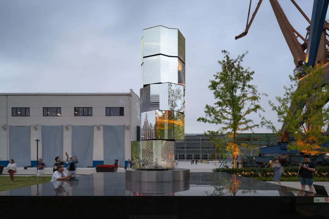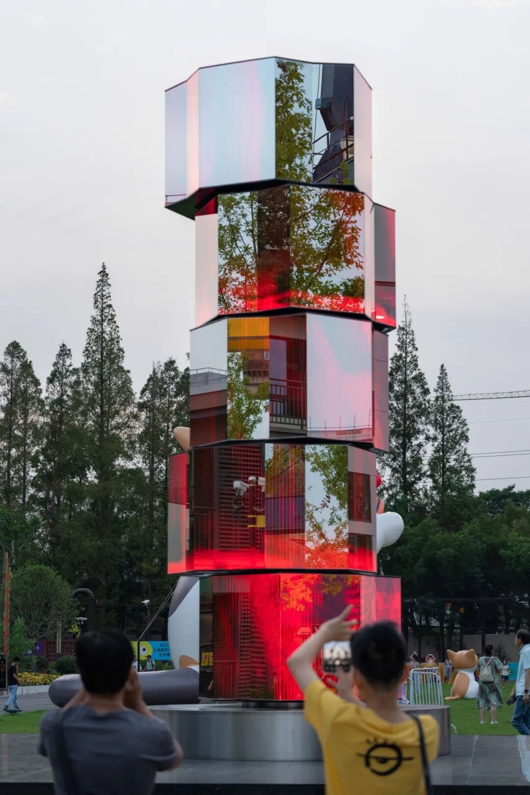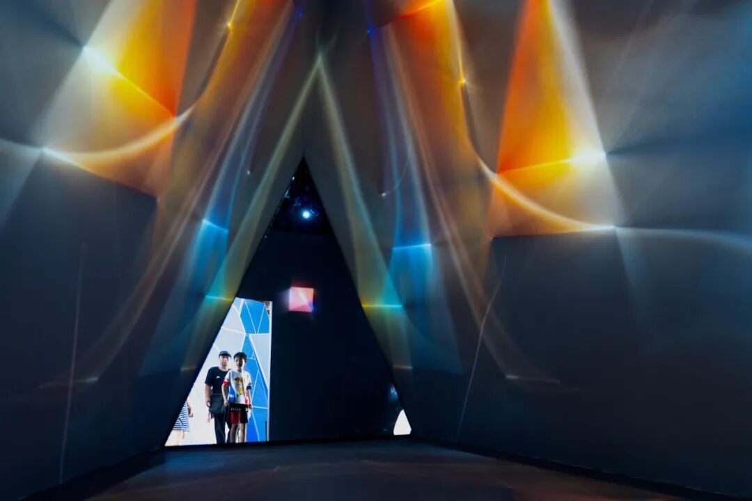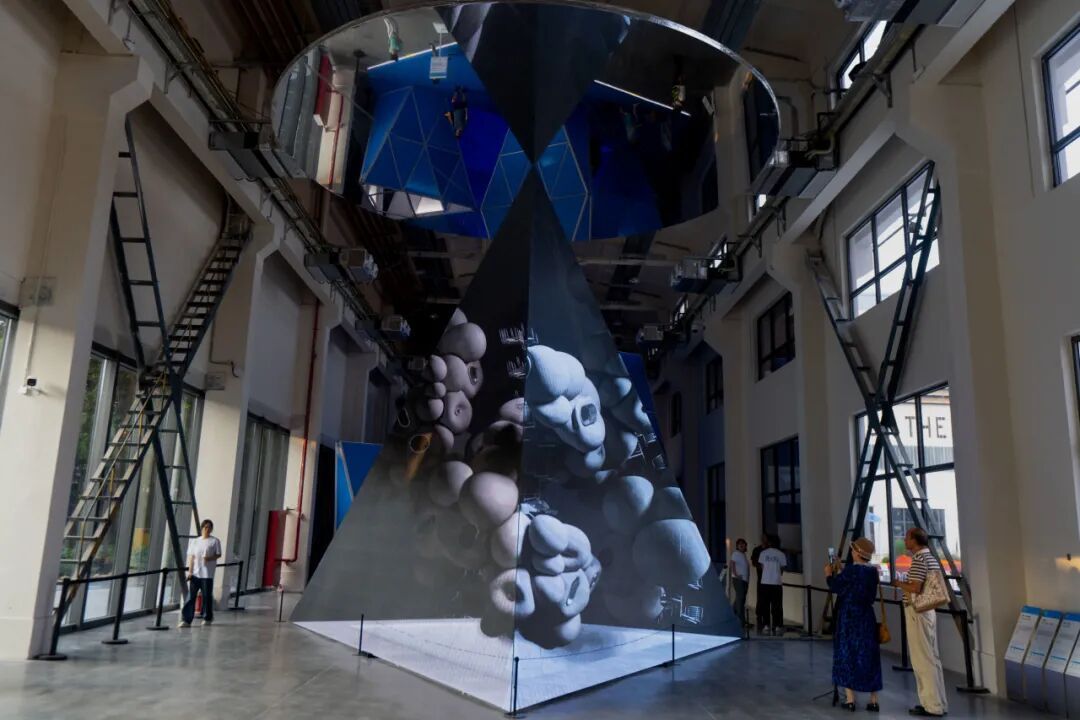 《量相》是一座以“光锥理论”为原型构建的三棱锥装置。其整体结构由一面顶部的巨型镜面及实体的数字装置组成,其中,装置外部被LED表皮所覆盖,内部为沉浸投影空间。同时,《量相》也是一次融合了机构创作与艺术家工作的策展实践。在其外部界面上,雷电所邀请了三位艺术家⸺Marpi 工作室、王一、罗曦⸺以各自独特的语言,共同构建出这个多维感知的数字表皮。