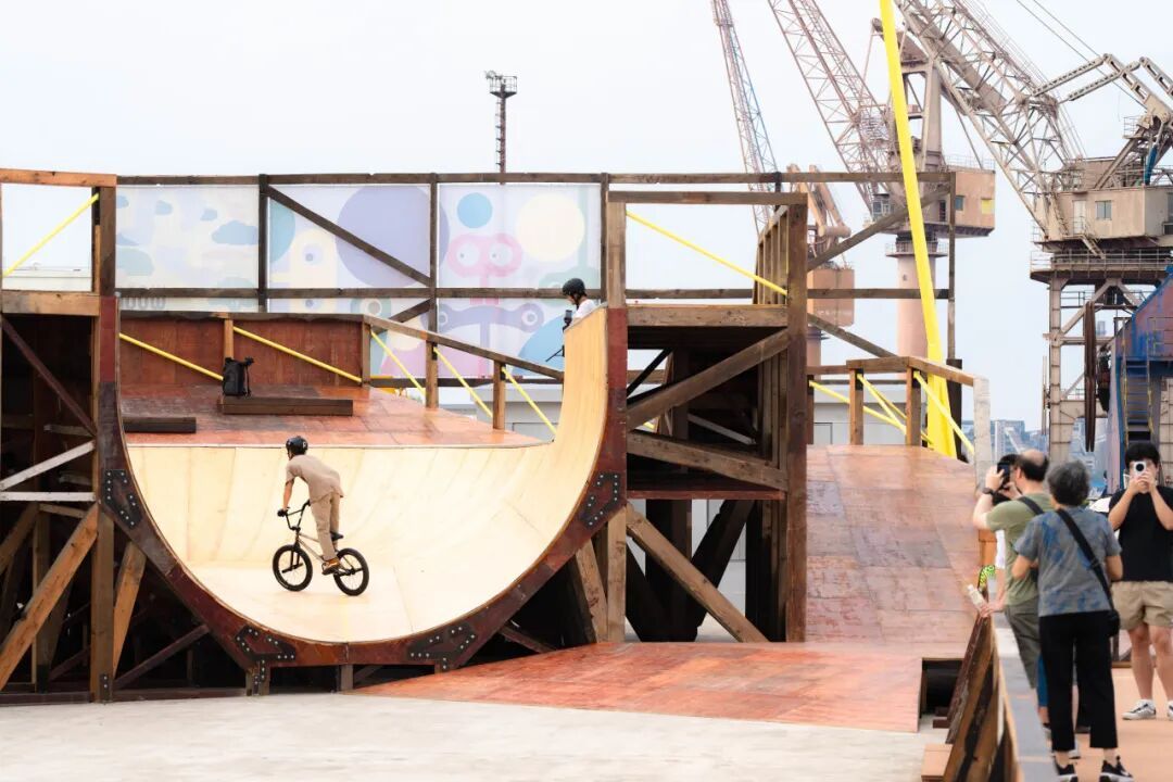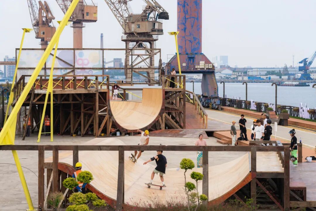 甲板滑板场位于复兴岛船台公园南端,其旧址为中华造船厂的一号码头。甲板采用回收旧木材作为结构支撑,借鉴脚手架的搭建方式,提供开放性的碗池和波浪型坡道。滑行轨迹所塑造的连续曲面,营造出类似造船过程中水线以下型线船体的制造场景。结构中融入了观众看台,并在看台下方设置休息与服务空间,形成一个多层次的开放场域。