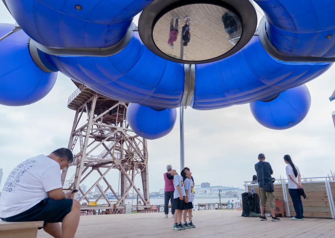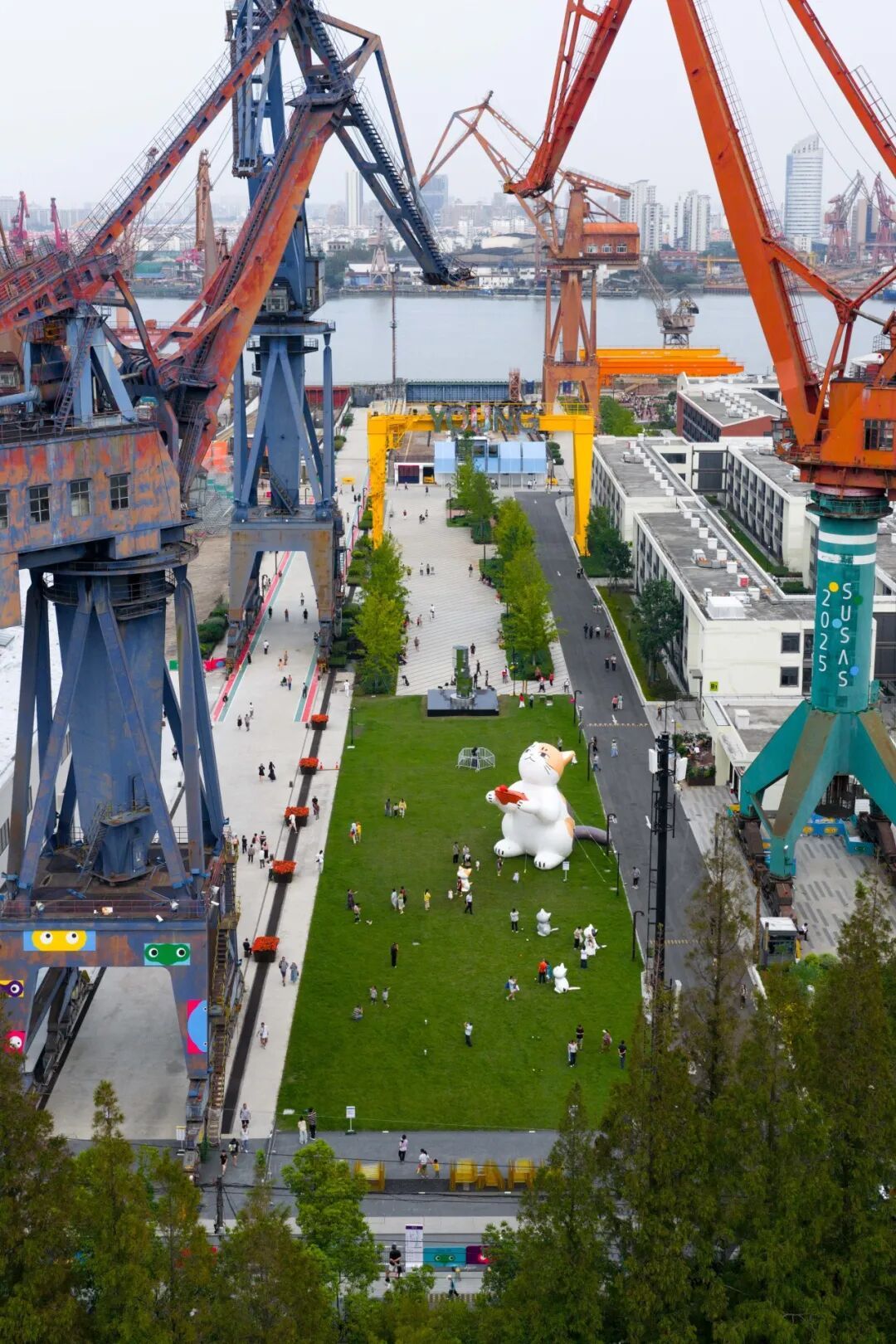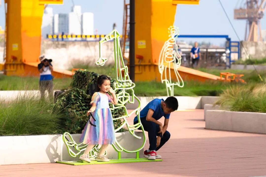 船台的工业风格象征着复兴岛的历史与力量,钢铁机械虽有冷峻威严的一面,一只猫和几只围观小猫的加入,使得厚重沉淀的工业与想象中的场所并存,同时增强了与观众共同在场的互动性。猫手持着遥控器,代表着用这一刻的时间与过去的时间相连,产生了新的城市空间想象力:人与工业、自然之间,也可以形成一种轻盈的互动关系。