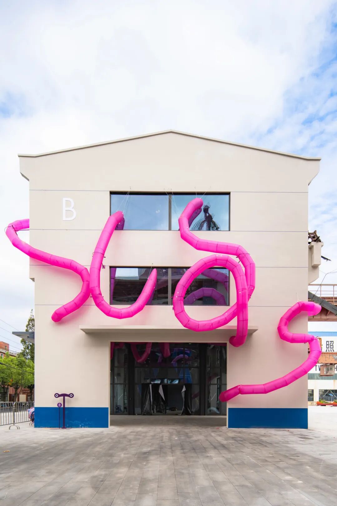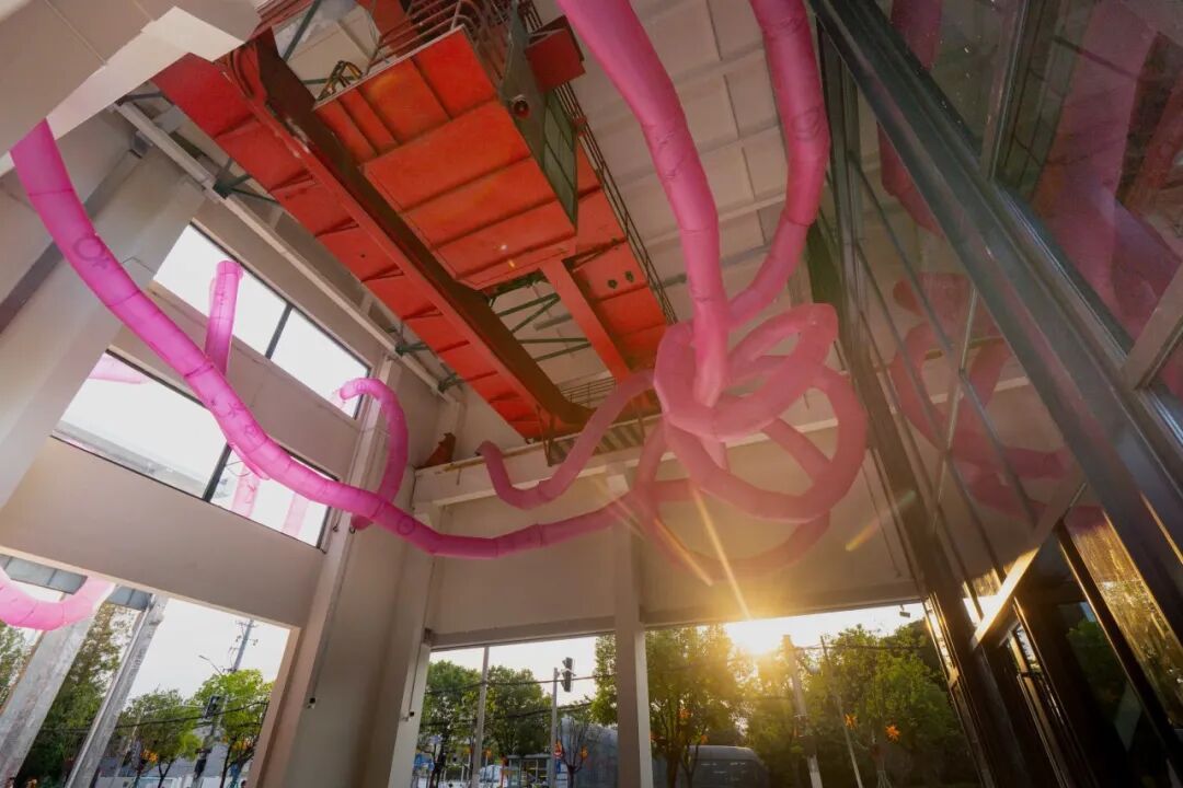 《隧穿》是一件气膜互动灯光装置。每当有观众步入空间,管道内即刻发出一个“光子”,沿道疾行。光线所经之处,也将照亮藏于管道内壁的天体符号,使其显影。在量子物理学中,“量子隧穿”指的是微观粒子能够穿过看似不可能穿越的能量屏障。该装置模拟了这一现象,并通过路径串联“SUSAS”的字母,融合贯穿原本的建筑结构,虚实相通。