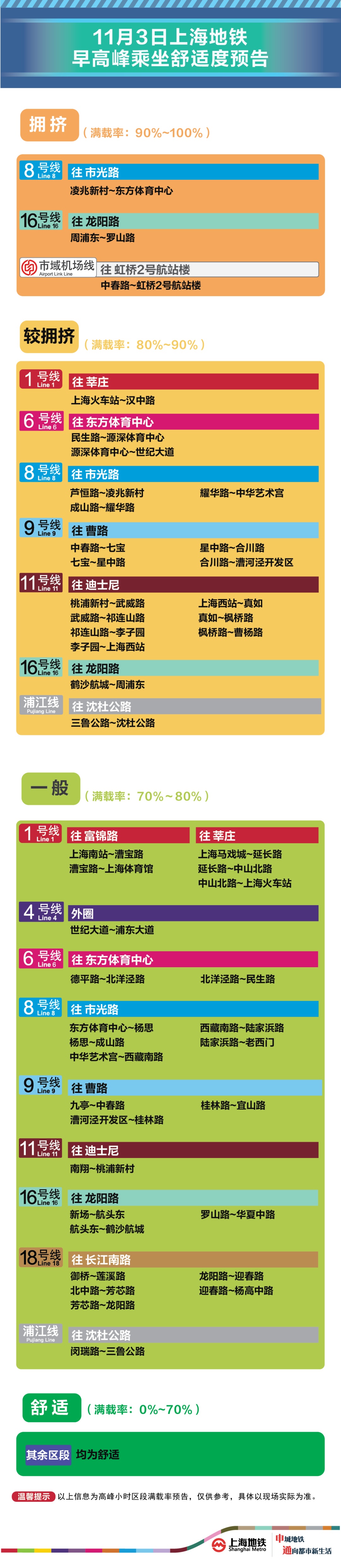 为提升上海地铁早高峰期间出行服务水平,提升乘客乘坐体验,上海地铁向乘客提供乘坐舒适度预告,方便乘客提