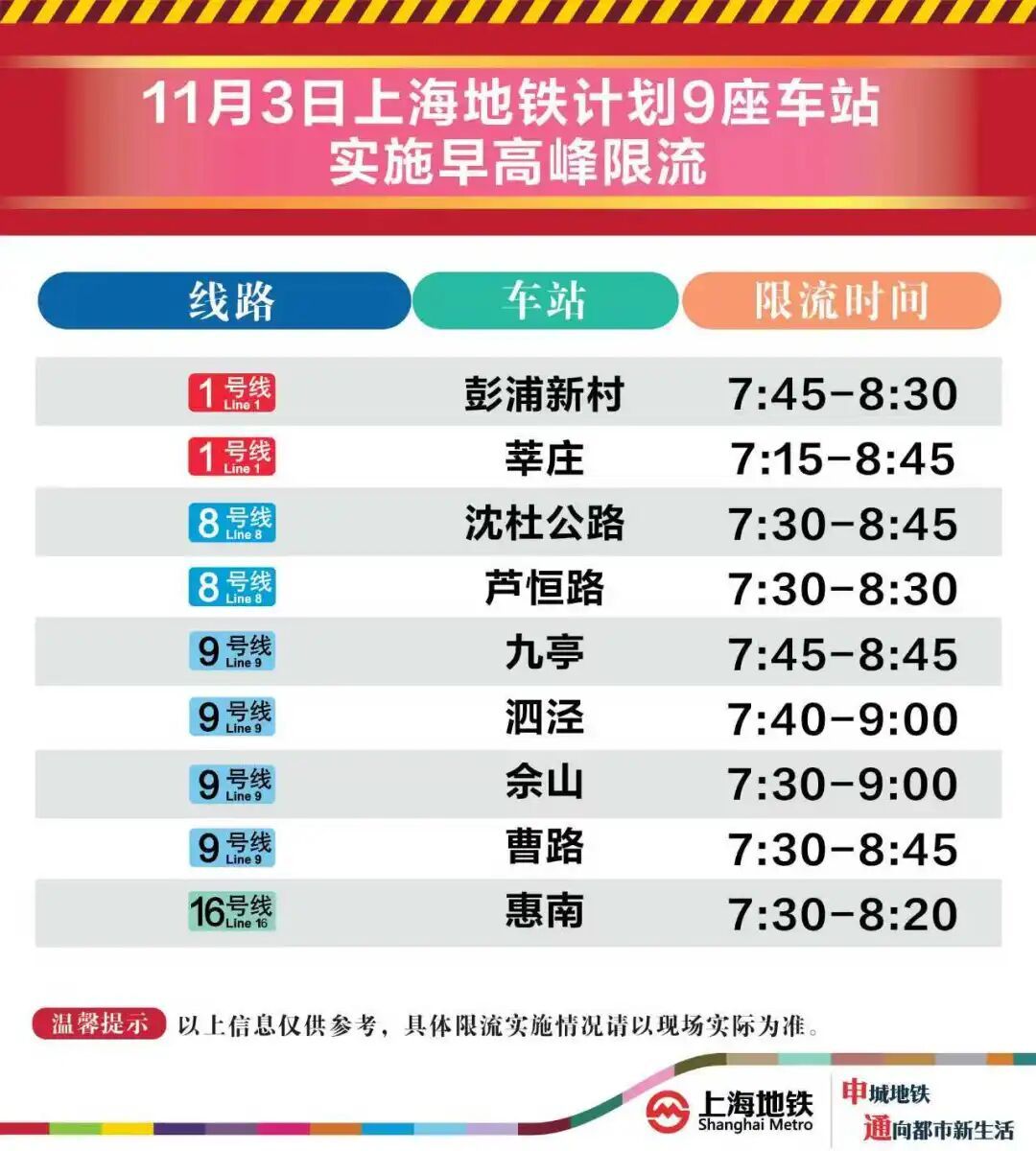 11月3日早高峰泗泾、佘山等9座地铁站计划限流