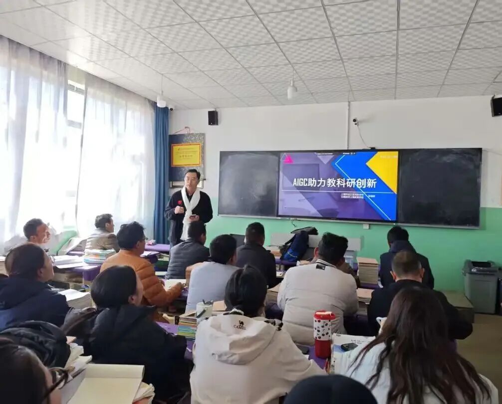 李朝辉开设了《AIGC助力教科研创新》讲座,现场反响热烈。李老师的讲座通过真实案例演示了AI在备课、学情分析等环节的应用,教师们亲身尝试提示词工程与智能工具,原本抽象的技术瞬间转化为可操作的教研新路径。李老师长期致力于教育数字化创新,其倡导的“循证翻转”教研模型曾获教育界广泛关注。此次他特别针对高原教师需求,展示了DeepSeek等工具在跨学科项目设计、教育教学论文撰写中的实战技巧。全体教师纷纷用手机尝试,现场创意涌现,一位藏族教师兴奋表示:“AI让复杂教研变得像发朋友圈一样简单!”