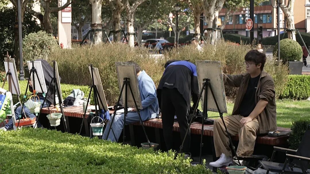 今日申城天气晴好,阳光洒满街头。清风徐徐吹来,体感舒适。上午十点,徐家汇书院广场上游人如织,不少市民和游客在此驻足,举起手机与周边的文化建筑合影;城市画家们支起画板、专注描摹,定格下秋意十足的美景。