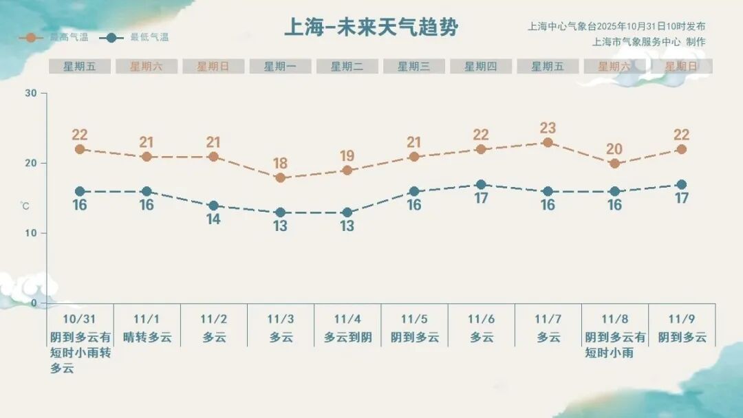 上海中心气象台预计,未来十天,上海基本保持这样秋高气爽的天气。双休日天气晴好,气温在14~21℃之间。早间较凉,白天舒适,适宜洗晒和出行。下周初有冷空气补充影响,云系增多,气温小幅下降,在13~19℃之间。之后申城天气又恢复秋日的美好。到下周六前后受短波槽东移影响有一次小雨过程。