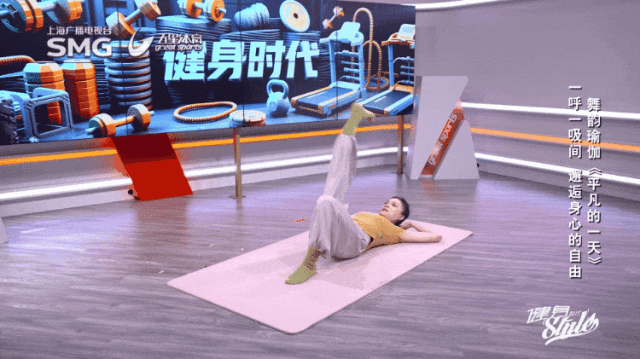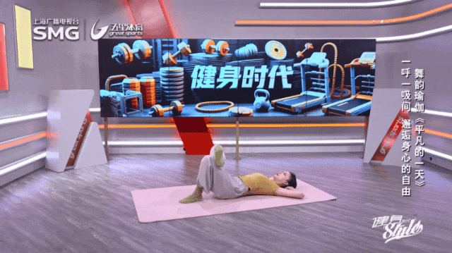 仰卧,屈双膝,右脚踝放到左膝盖上,双臂在头顶互抱。