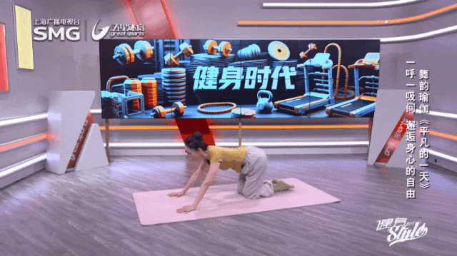 【上犬式】双手支撑,撤左脚至下犬式,弓背重心向前,脊柱流动沉髋打开胸腔。