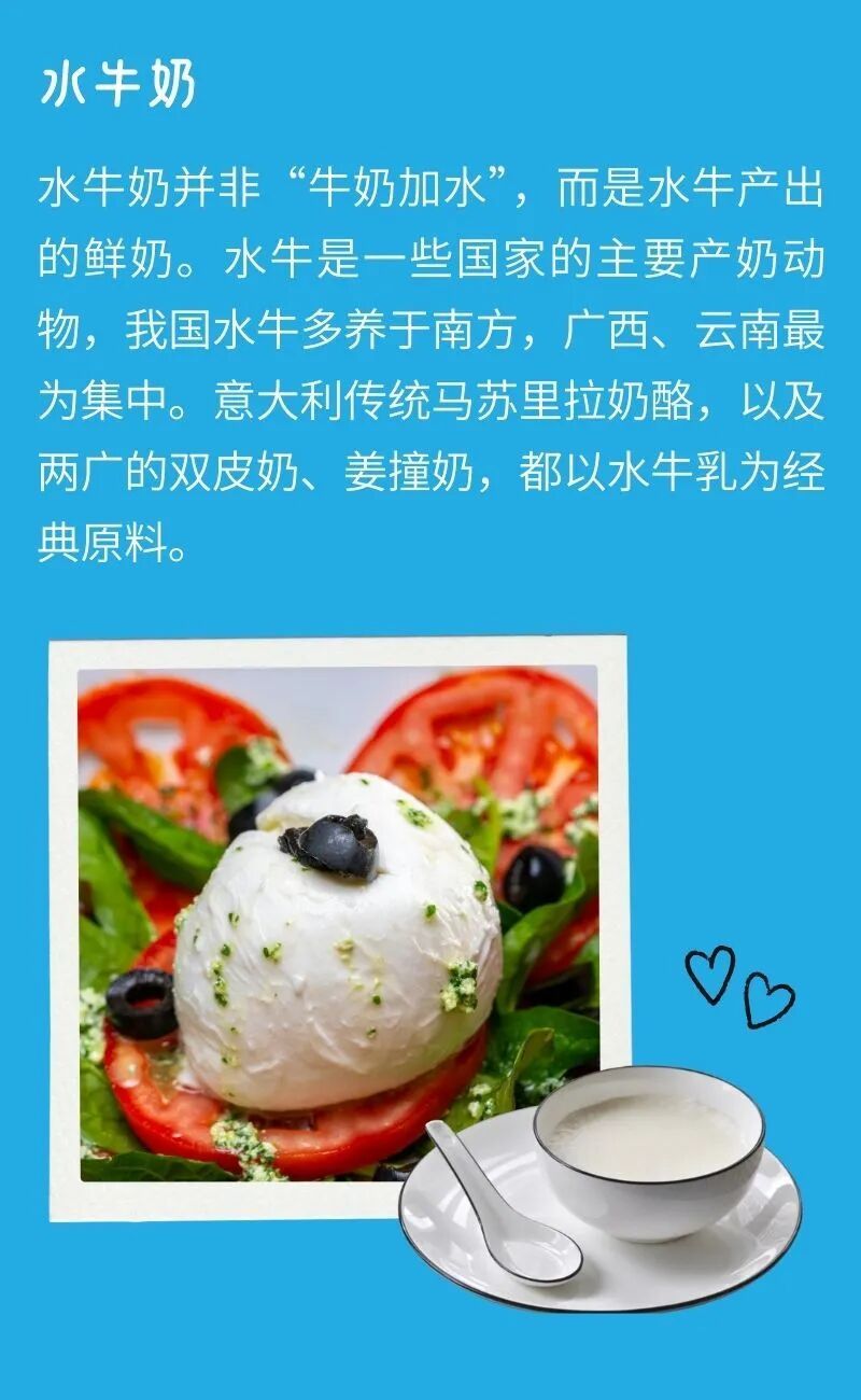 水牛奶的乳脂肪、乳蛋白、矿物质、维生素、乳糖等营养成分均高于牛奶。在较高脂肪、蛋白和乳糖的作用下,水牛奶的口感更加香浓丝滑,也更甜(热量自然也高些)。
